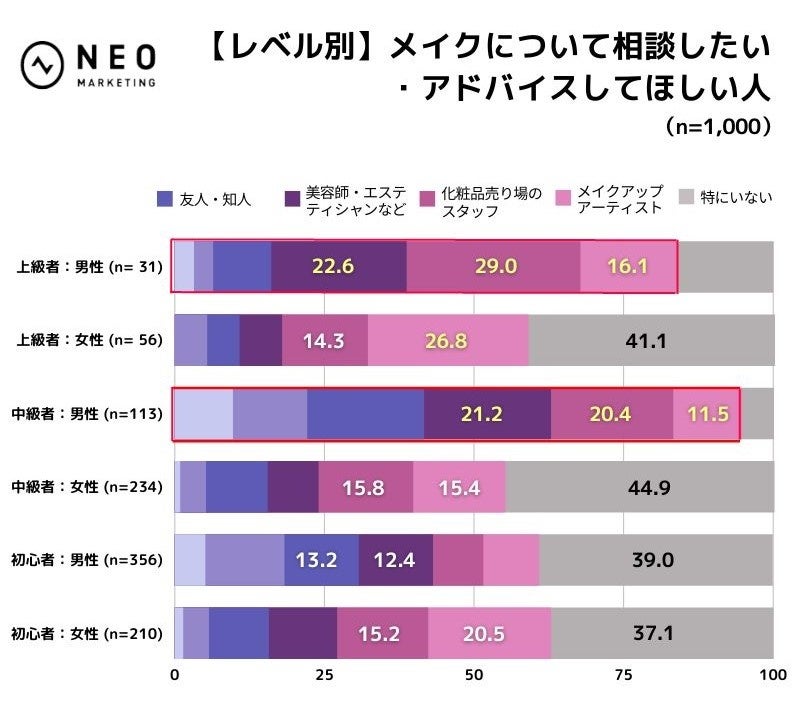 男女ともに「メイクアップアーティスト」との相談やアドバイスを求める割合は、初心者・中級者よりも、上級者の方がむしろ多いことがわかります。特に女性はその傾向が強いようです。