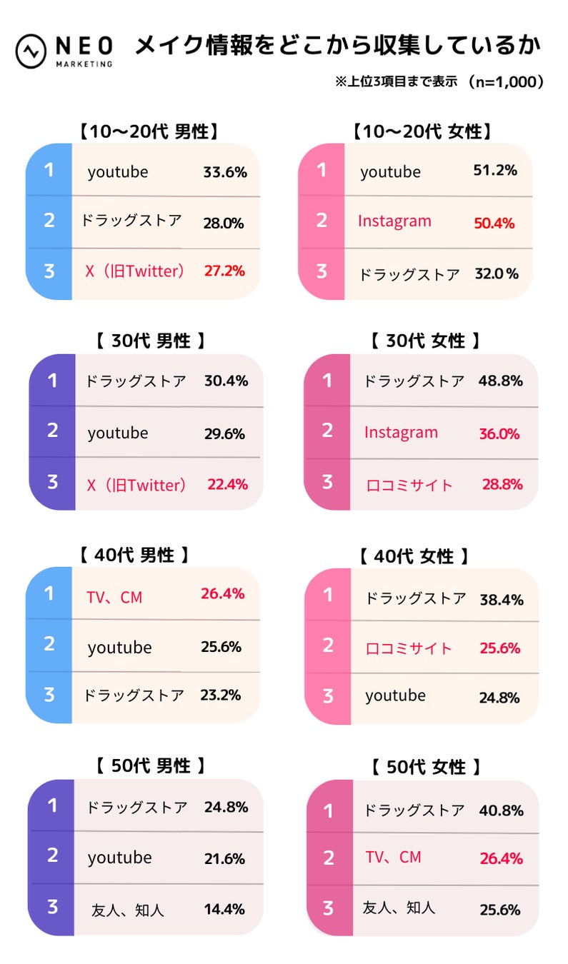 メイク情報をどこから収集しているか:「ドラッグストア」が最も多く、10〜20代はSNSが圧倒的。