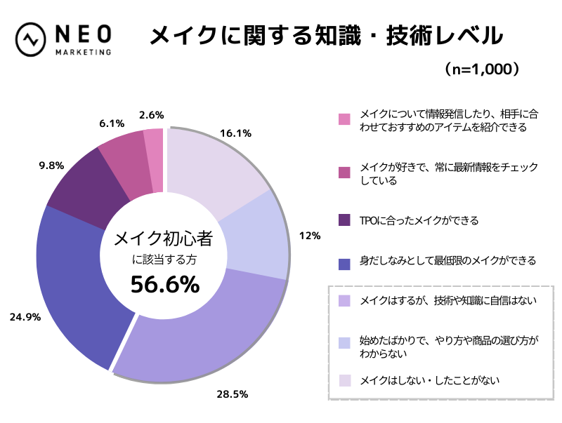 「始めたばかりで、やり方や商品の選び方がわからない」「メイクはするが、技術や知識に自信はない」と、知識・技術ともに自信が無い人の割合が48.3%、「興味はあるがメイクをしたことがない」という人を含めると56.6%を占めています。