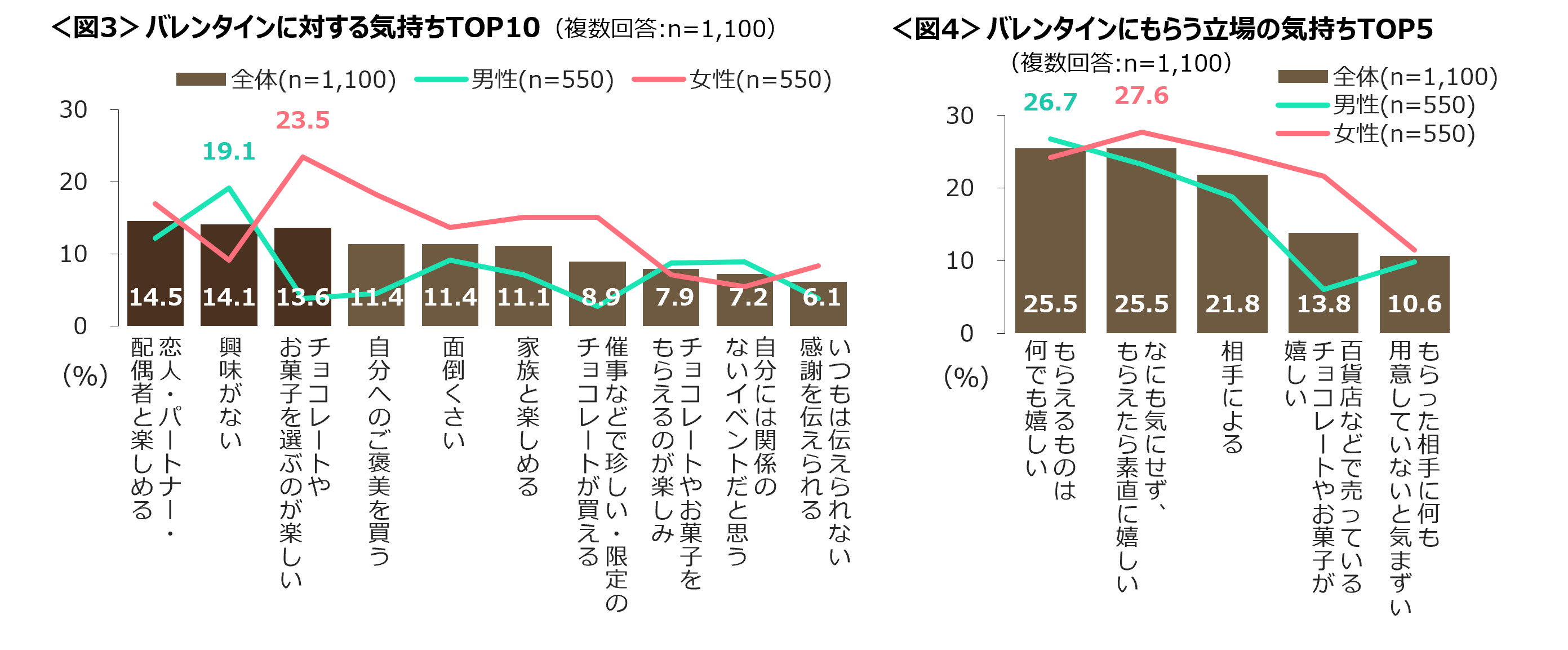 バレンタインに対する気持ちでは、女性のTOP2は「チョコレートやお菓子を選ぶのが楽しい」「自分へのご褒美を買う」、男性は「興味がない」「恋人・パートナー・配偶者と楽しめる」であり、性別による違いがみられる。<図3>