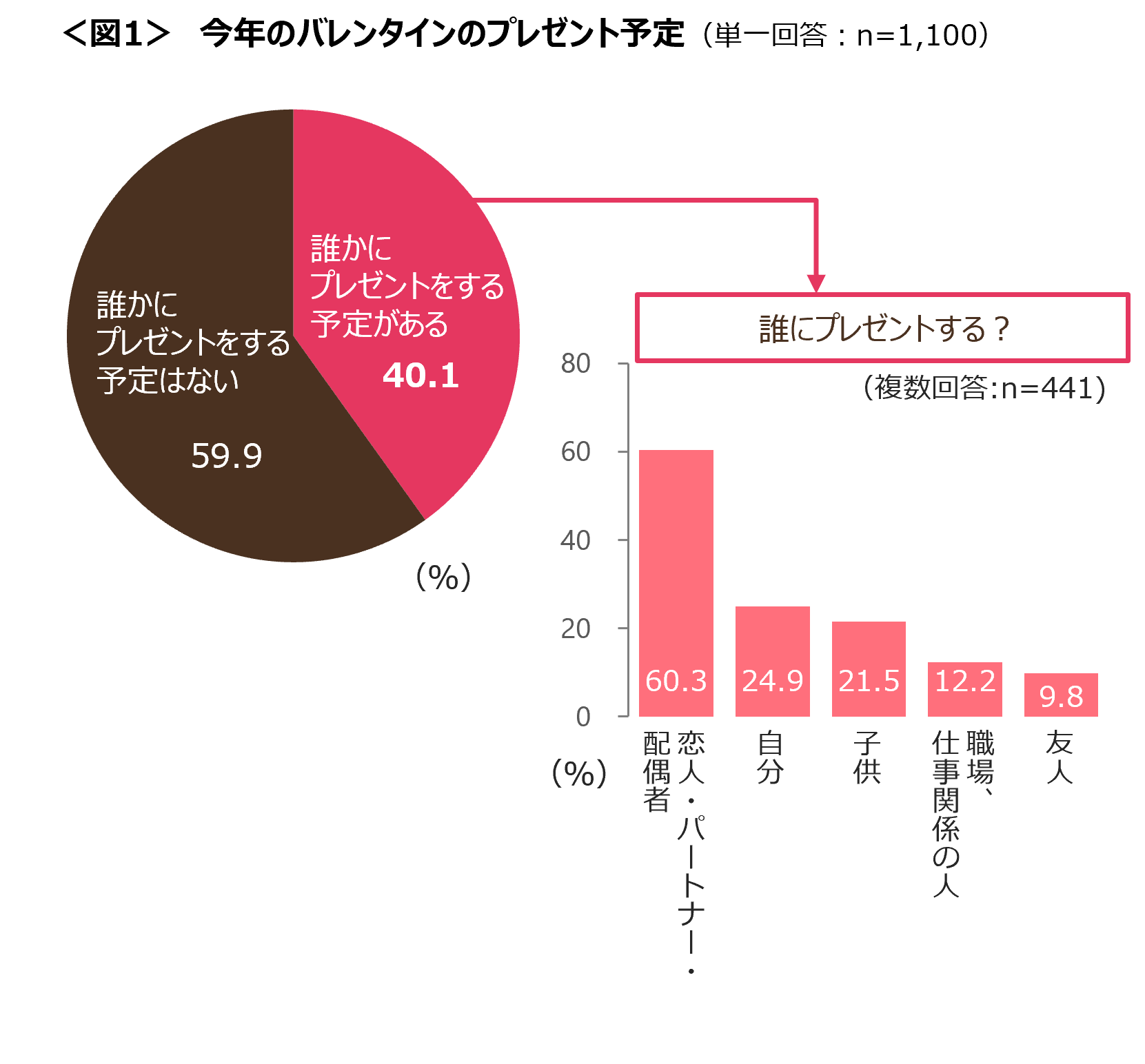今年のバレンタインは「プレゼントをする予定」の人が4割。「恋人・パートナー・配偶者」へ贈るが6割。<図1>
