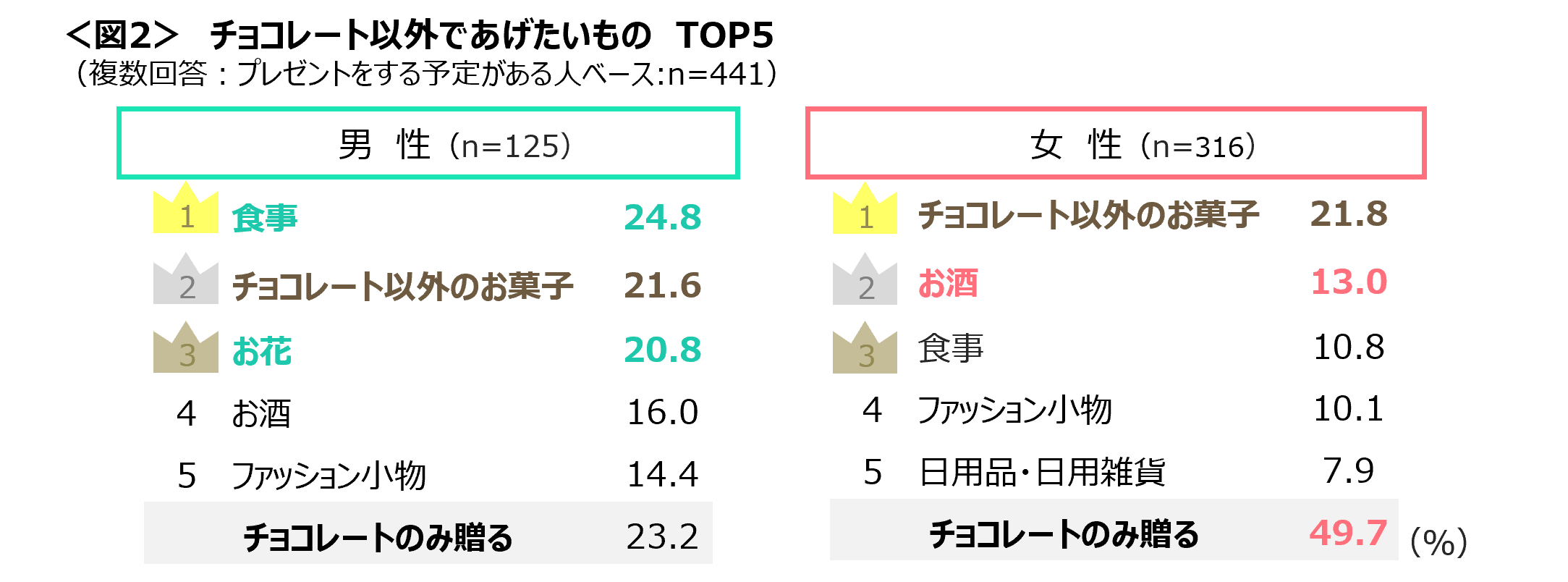 「チョコレートのみ贈る」割合は、男性23.2%に対し、女性は49.7%と高い。
