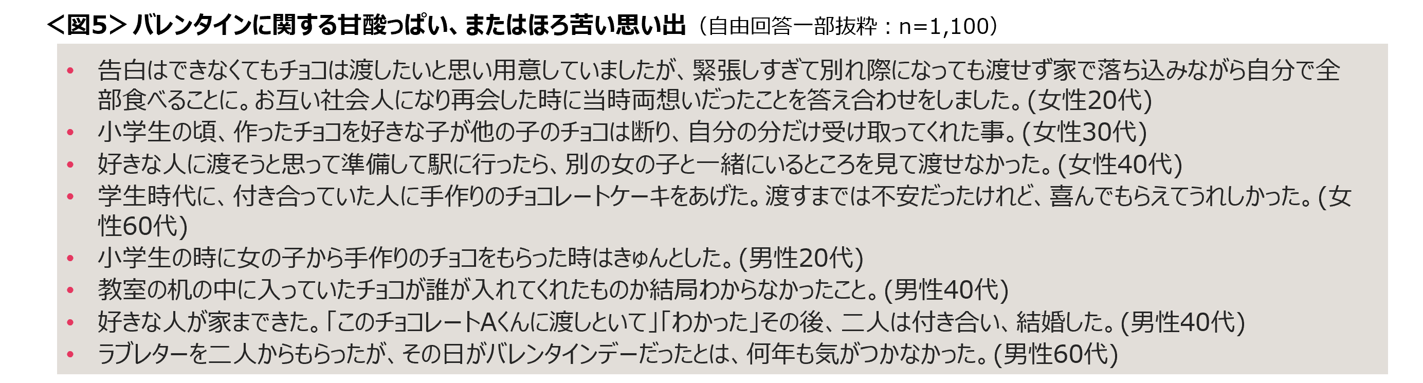 バレンタインの甘酸っぱい、ほろ苦い思い出は、女性では渡そうと準備していたが渡せなかった思い出、男性では手作りのお菓子が貰えて嬉しかったといった回答が見られた。<図5>