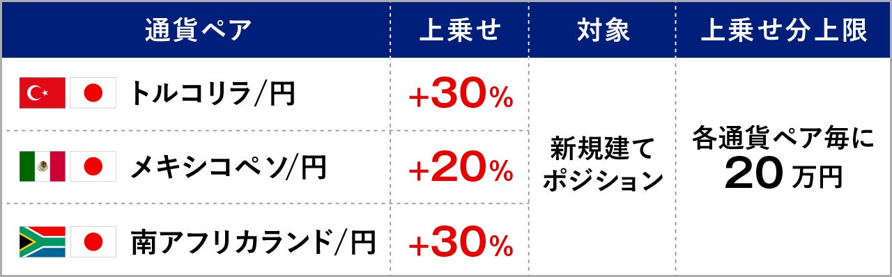 SBI FXトレード株式会社(本社:東京都港区、代表取締役社長:藤田 行生)は、本日よりトルコリラ/円(TRY/JPY)・メキシコペソ/円(MXN/JPY)・南アフリカランド/円(ZAR/JPY)において、新規建てしたポジションを対象に受取りスワップポイントに上乗せして、キャッシュバックするキャンペーンを実施いたします。増額率はトルコリラ/円で30%、メキシコペソ/円で20%、南アフリカランド/円で30%となります。