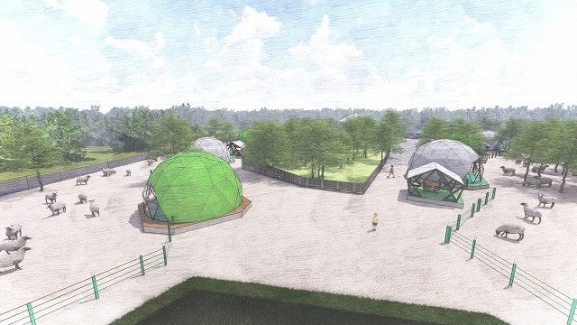 りんどう湖ファミリー牧場の入園が無料になる人気のグランピングに、新たに、アルパカと泊まれるグランピング8棟が仲間入りします。アルパカの群れの中に柵で囲まれたテントが存在しているため、超至近距離に近づく不思議な体験をしていただけます。夕食、朝食をアルパカにごはんをあげながら過ごしたり、朝カーテンを開けた瞬間からアルパカと目を合わせたり、日本初の経験※を、朝、昼、夜と楽しむことができます。