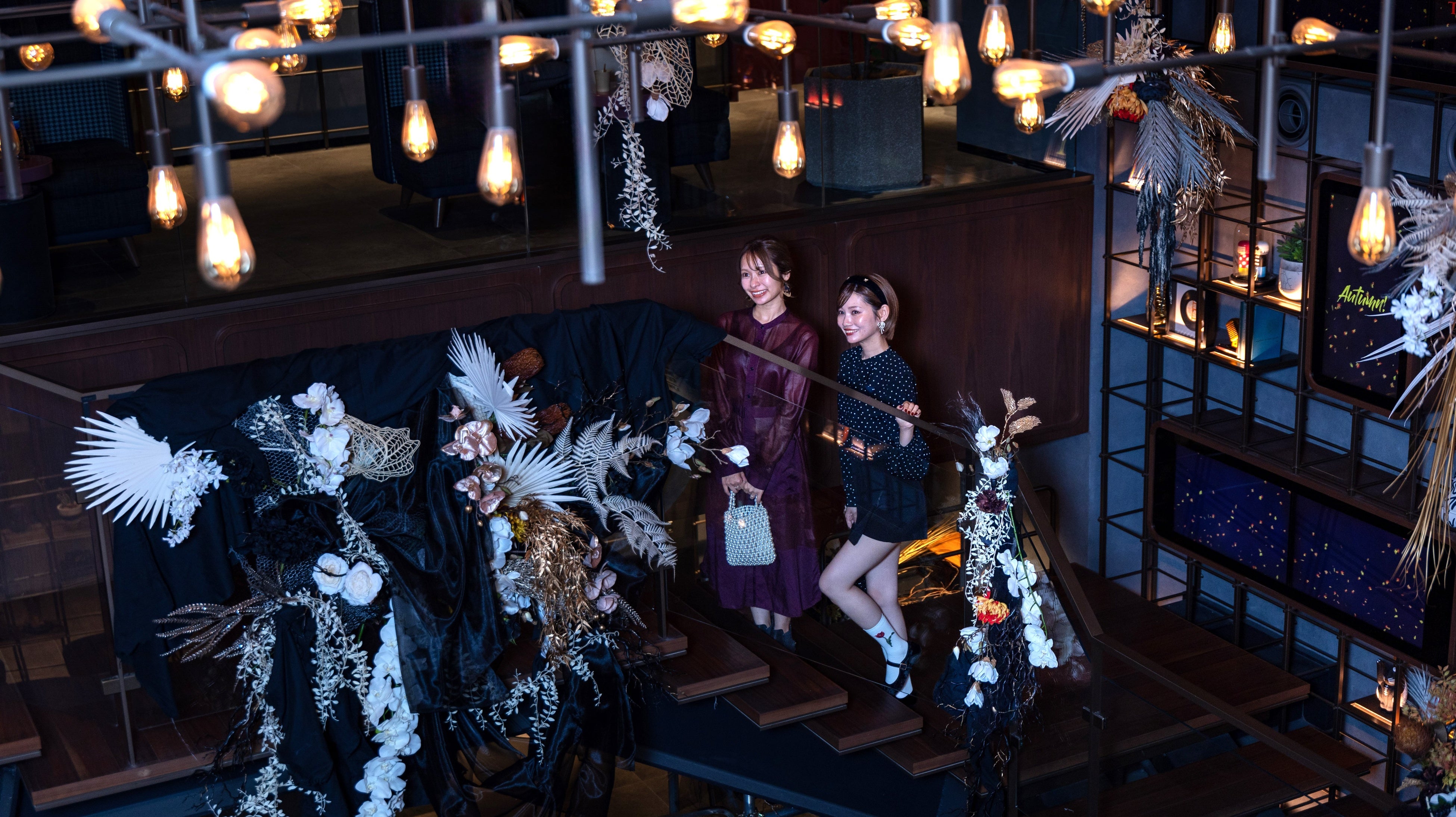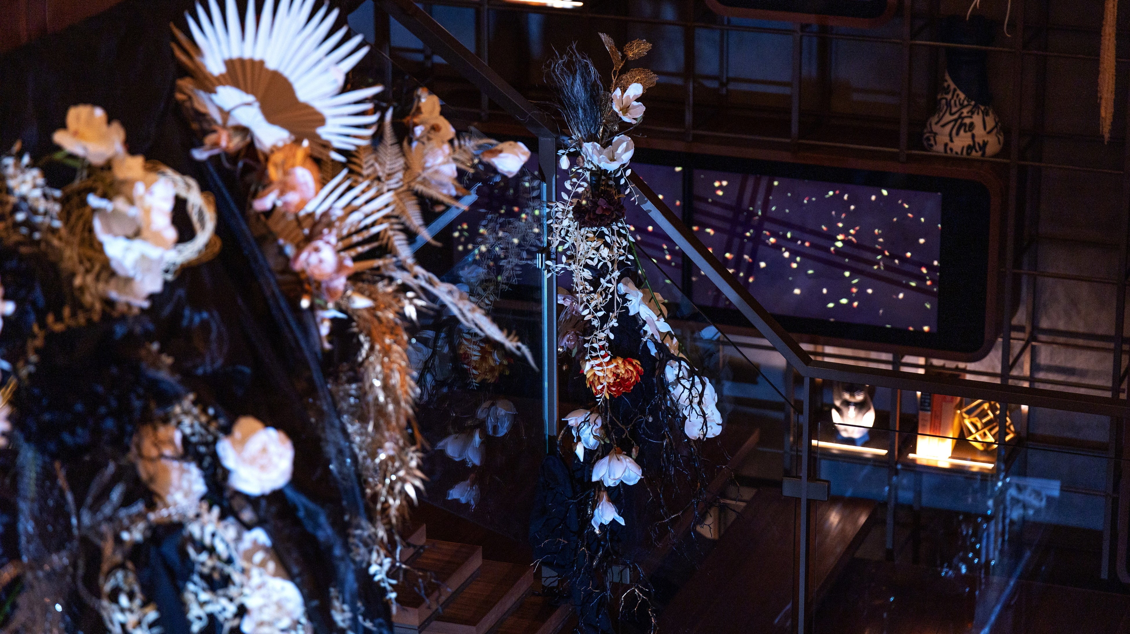 人気エリアのロビーラウンジでは、フラワーアートを用いた美しい空間演出を実施しています。ロビーラウンジから2階へと広がる吹き抜けの天井と階段には、白と黒を基調とし、秋らしい色合いを織り交ぜたハロウィンも感じさせるフラワーアートが飾られています。ゴールドに輝く照明やサイネージディスプレイとの融合も見どころです。ご家族やご友人と一緒に、思い出に残る写真撮影をぜひお楽しみください。宿泊ゲスト以外の展示見学も可能ですので、ご家族やご友人をお誘い合わせの上お気軽にお立ち寄りください。