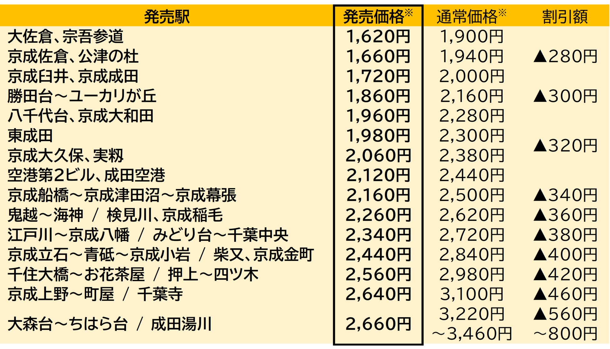 ※「通常価格」とは、本企画乗車券と同一経路で各交通機関を利用した場合の普通運賃(大人)と、酒々井プレミアム・アウトレットお買い物引換券1,000円分の合計金額です。