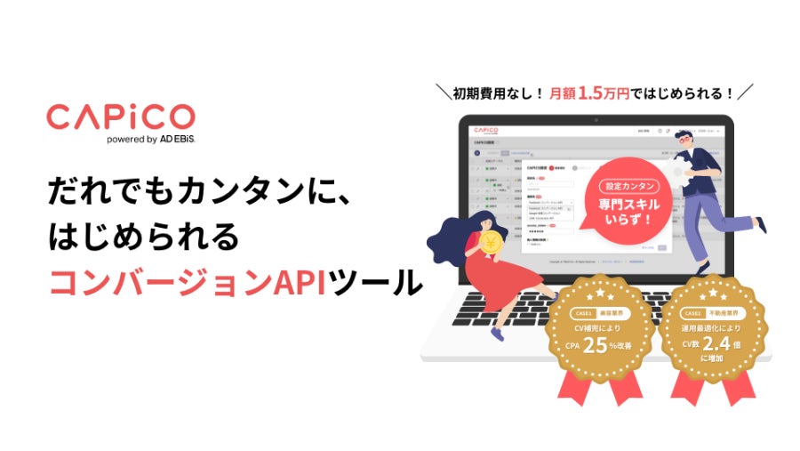 CAPiCOは、広告効果測定ツール「アドエビス」の計測基盤を活用したコンバージョンAPIツールです。3rd Party Cookie規制下における正確なデータ計測と広告運用の最適化を支援し、マーケティングによる企業の収益拡大を可能にします。