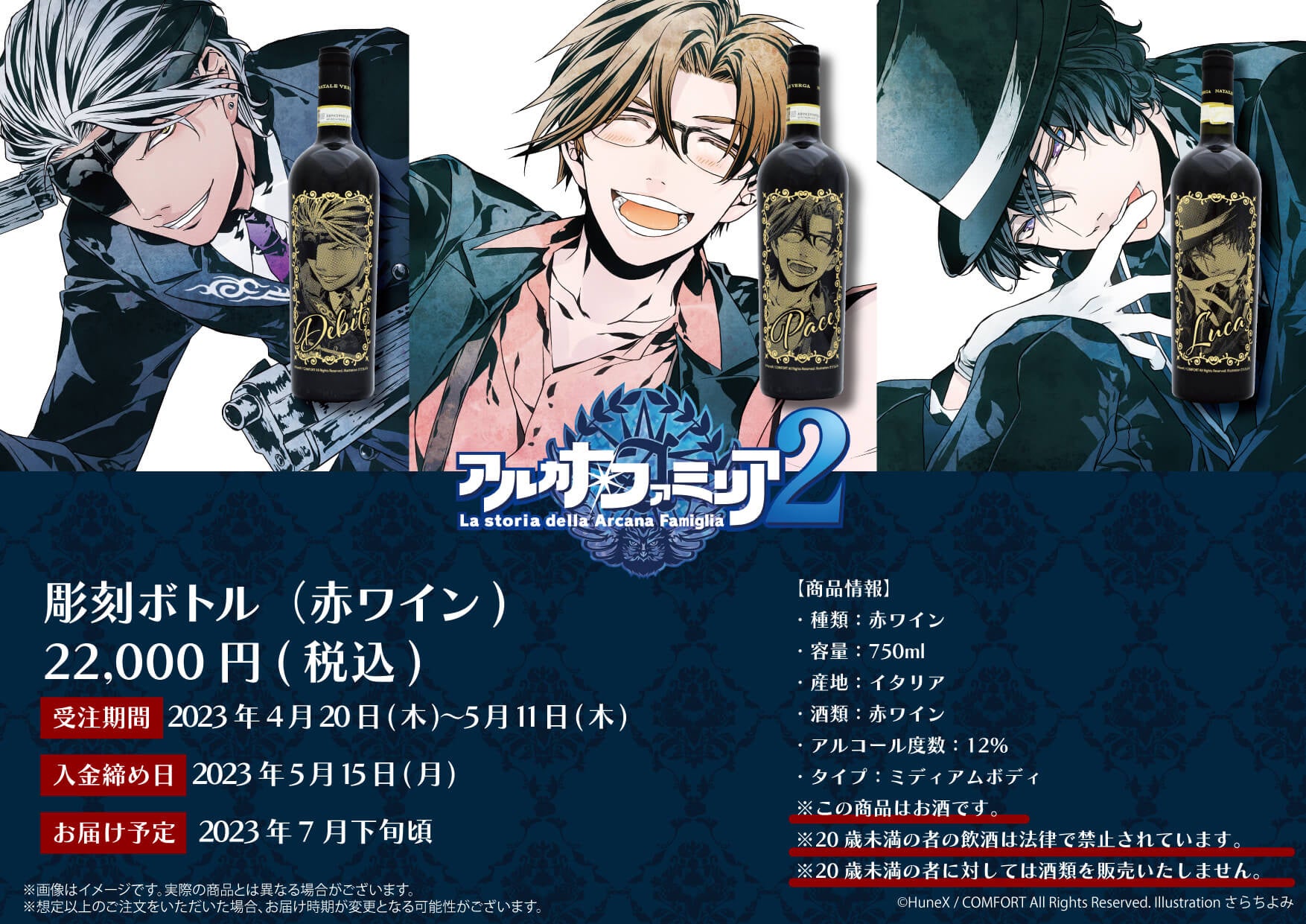 『アルカナ・ファミリア2』の彫刻ボトルが4月20日より予約受付スタート! デビト、パーチェ、ルカを描いたワインボトルは大人の色気漂う極上の一品