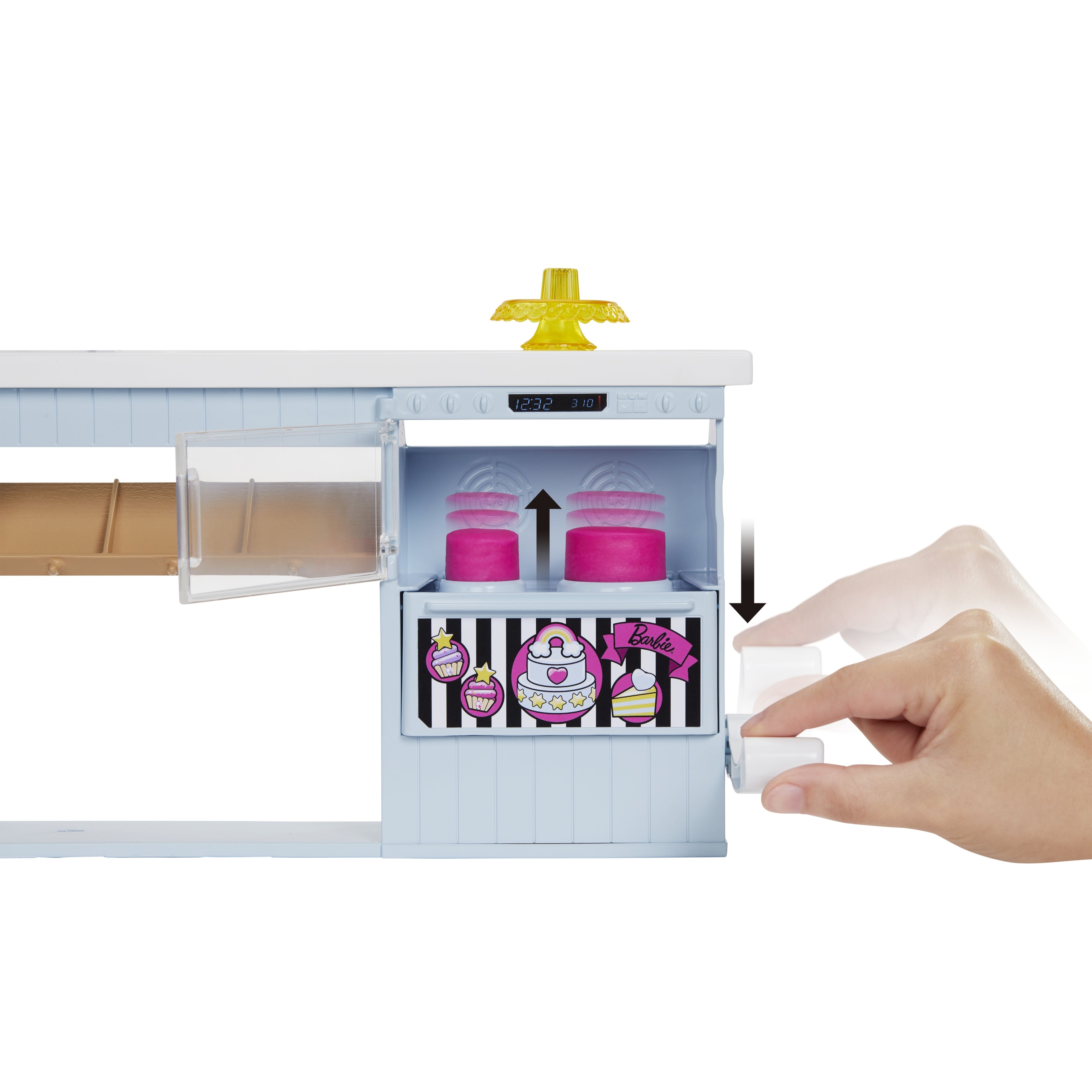 ピンクヘアーとストライプワンピースを身に着けたかわいいドール、カップケーキ型など10種類以上のアイテムを使って、お子さまの人気No.1職業のケーキやさん(マテル調べ2021)が体験できるセットです。ピンクとブルーの2種類のねんどでつくったケーキをオーブンに入れ、レバーを引くとケーキが盛り上がるのを見ることができたり、焼きあがったケーキをデコレーションやトッピングして楽しむこともできます。