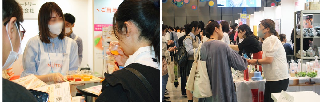 60社の「看護師を応援したい」企業が軒を連ねた協賛企業の出展エリア。グルメ、美容、ヘルスケア、マネー、ファッション、ライフスタイルなどのカテゴリの企業がサンプリングや体験会で来場者をもてなしました。企業出展エリア内は終日大盛況で、午前中に配布予定のサンプルがなくなるブースもありました。