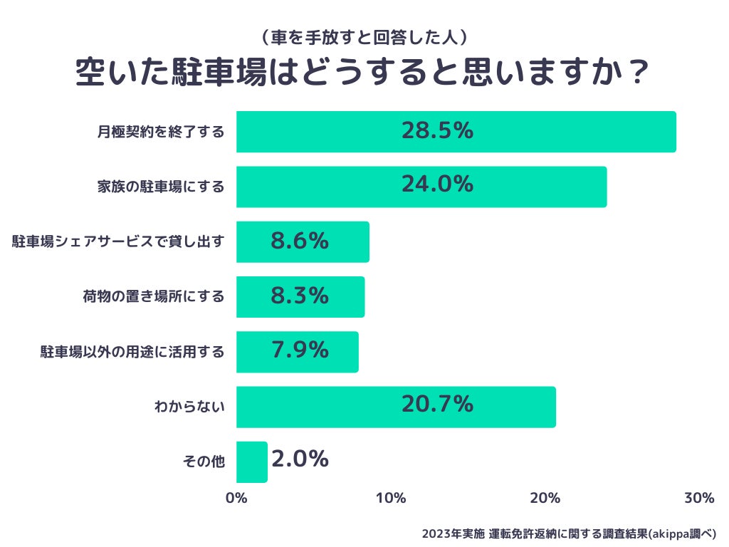 ・運転免許返納後は車を手放す考えの人が多数。そのうち8.6%の人は空いた駐車場をakippaなどの駐車場シェアサービスに貸し出す意向がある