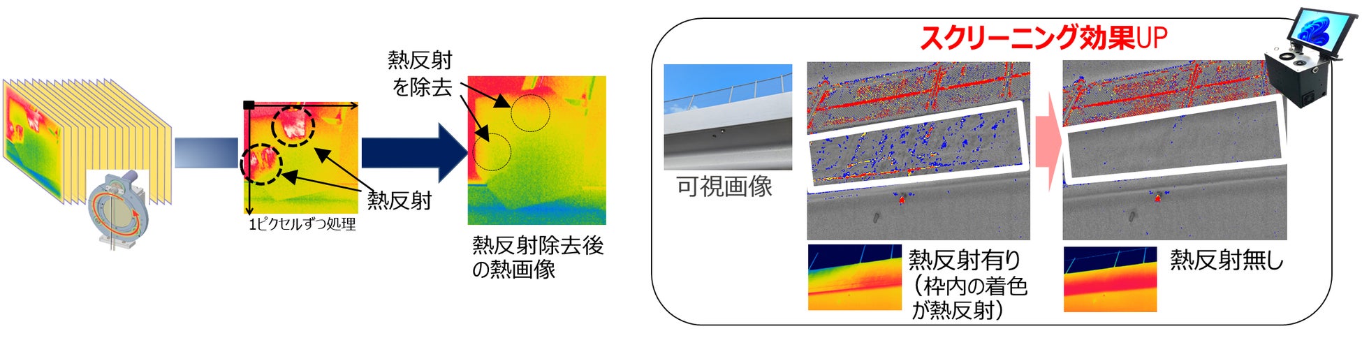 開発したカメラは、以下の方法により全方向の熱反射除去を自動化しました。