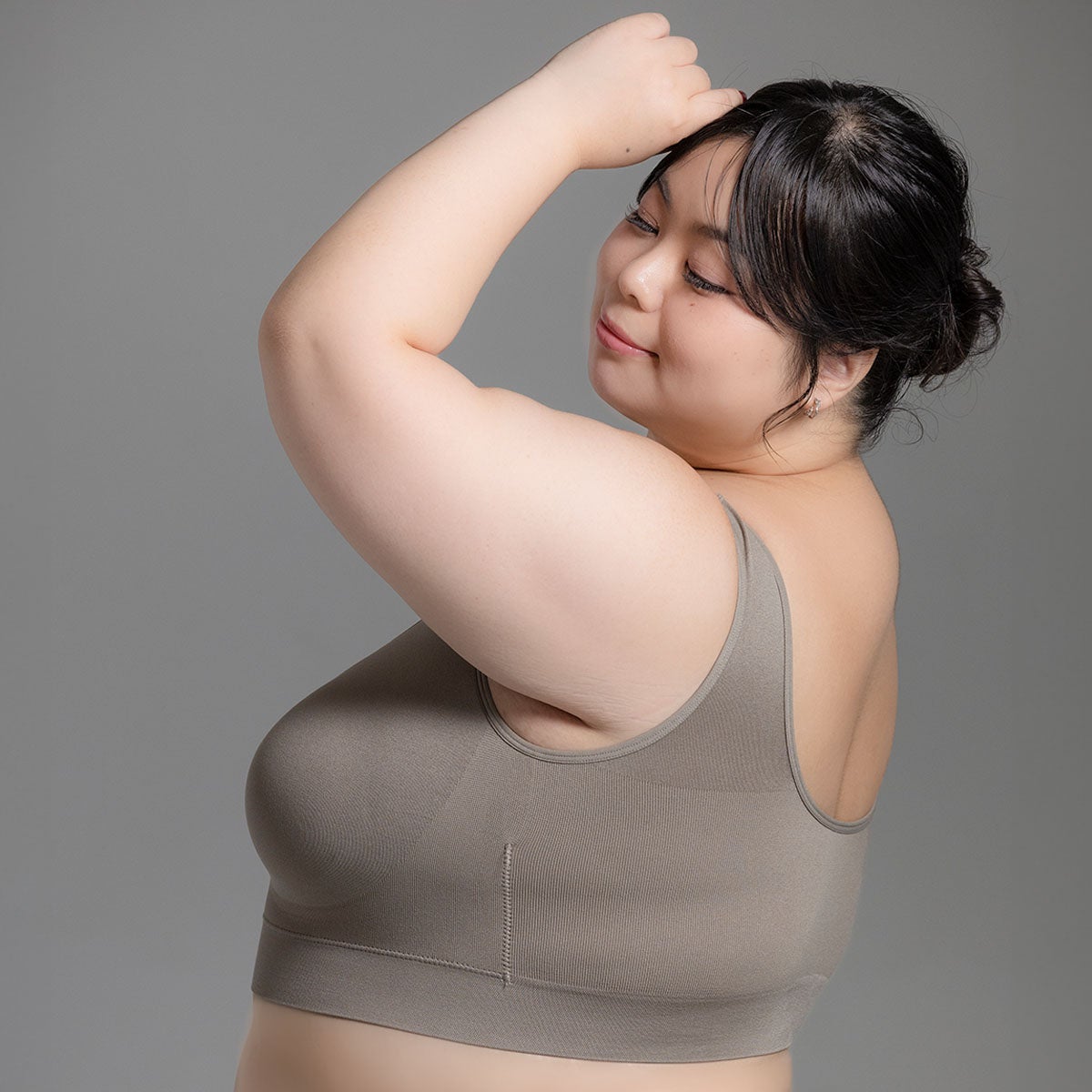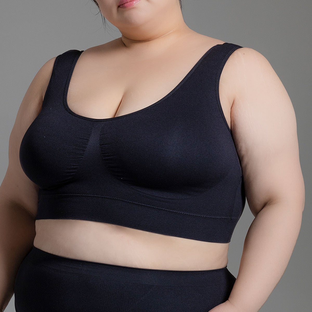 商品について :ノンワイヤーでシームレス仕様なのでごろつきにくく楽ちんな着心地でありながら、脇高設計とリフトバンドでしっかりバストを支えてくれるハーフトップです。