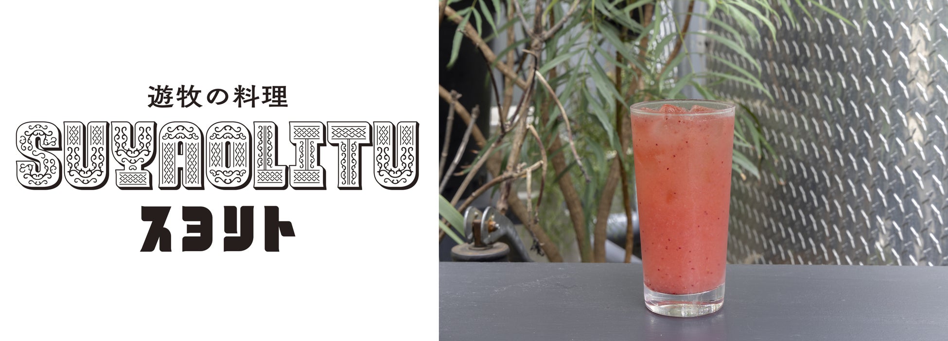ヨーグルトのような香りとキャラメルのような味わいを併せ持つ馬乳の蒸留酒(アルコール度数39度)に、いちごさんを漬け込みました。それを提供前にフードプロセッサーで撹拌し、ソーダアップしてお出しします。甘苦いキャラメルの味わいを背景に、いちごさんの酸味とベリー感が際立ちます。