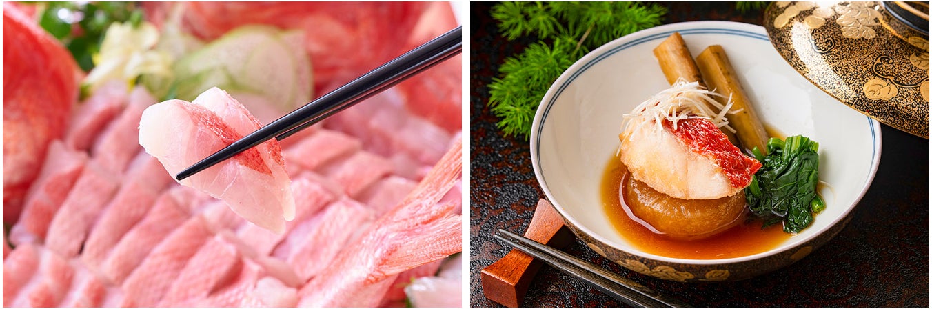 左:金目鯛のお造り。もっちりとした食感とくせの無い身、上品な脂で何切れでも食べたくなる美味しさを食べ放題でお楽しみください。