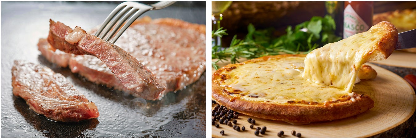 左:ライブキッチンから焼きたてをご提供する「サーロインステーキ」ももちろん食べ放題。育ち盛りのお子様も大満足!