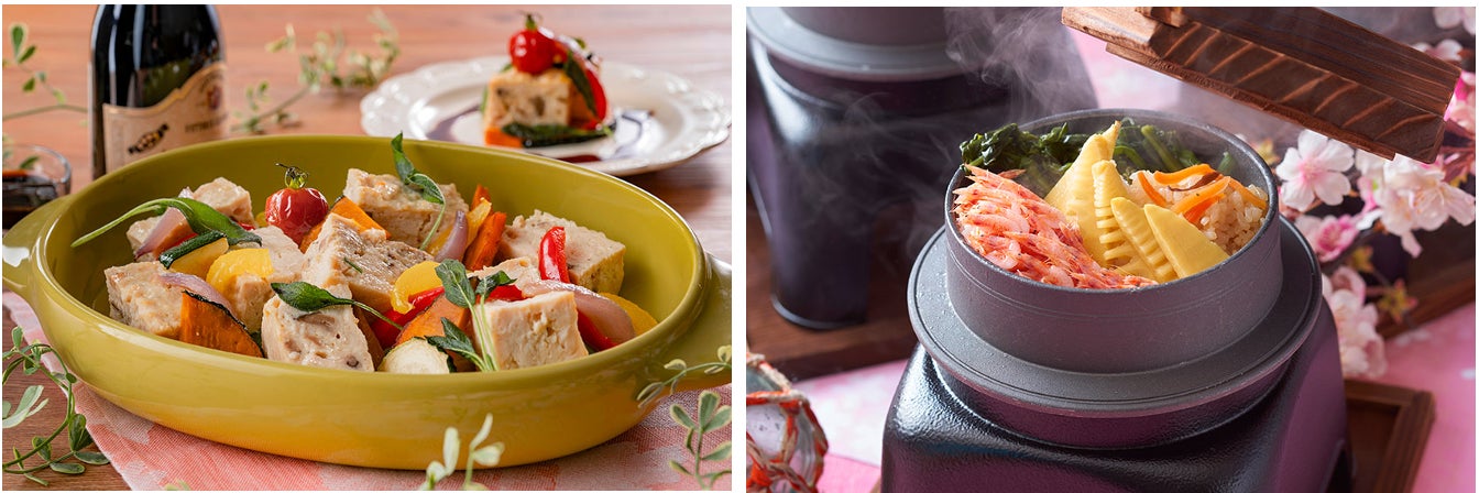 右:「桜えびと山菜の釜めし」はお席でひとり用の釜で炊き上げてお楽しみください。お米の炊ける甘い香りや、炊き上がりに蓋を開けると立ち昇る湯気もご馳走です。