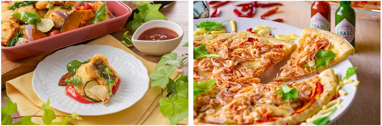 右:たけのこなどの春野菜と桜えびをトッピングしたピザ。彩り鮮やかな見た目とクリスピーな食感をお楽しみください。