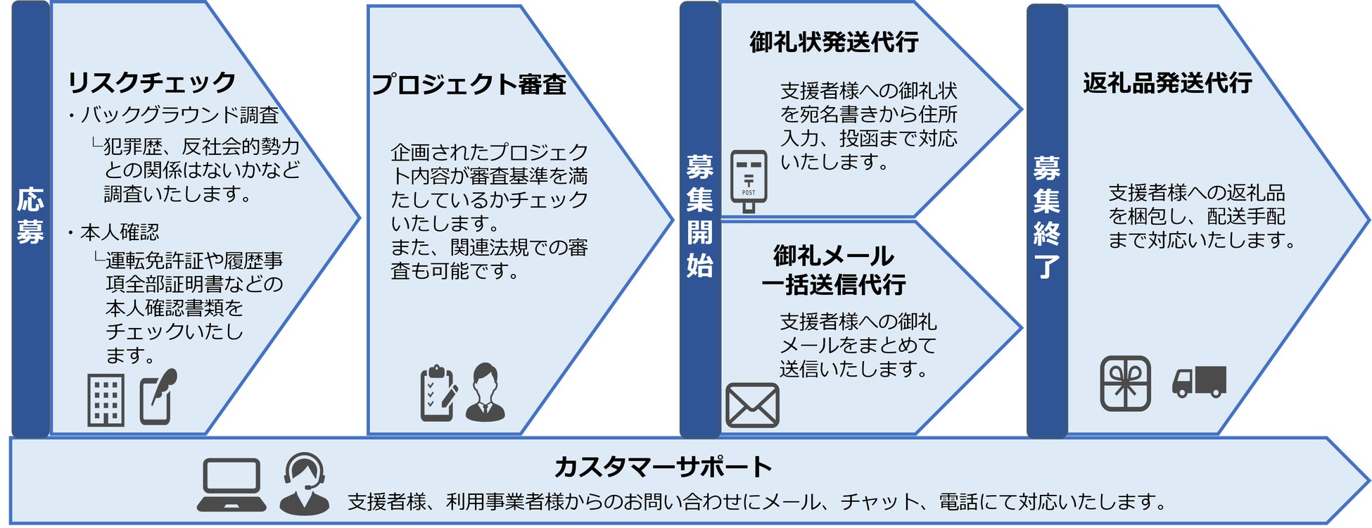 本サービスは、募集開始後に発生する支援者様への「御礼状発送」や「御礼メール送信」、「返礼品の梱包・発送」などといった多岐にわたるバックヤード業務を一手に引き受け、ご担当者様が企画立案やサービス改善といったコア業務に集中できる環境を整えます。それと同時に、プラットフォームの安全性を担保するため「プロジェクト実行者のバックグラウンド調査」や「本人確認書類チェック」、「プロジェクト内容の審査」も実施。事前にリスクを検知・排除することで、事業者様と支援者様の双方が安心して利用できる、健全なプラットフォーム環境の維持に貢献いたします。