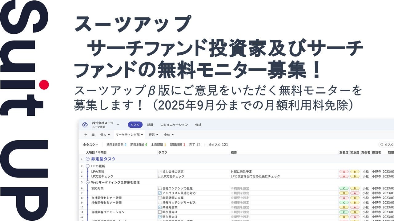チームのタスク管理・プロジェクト管理ツール「スーツアップ」、サーチファンド投資家及びサーチファンドの無料モニター募集