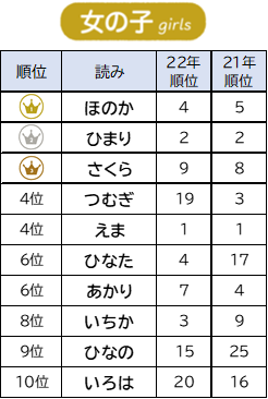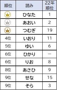 TOP2は22年、21年と同じ、1位「ひなた」2位「あおい」の名前がランクインしています。今年はさらに昨年まで上位になかった「つむぎ」、「いおり」、「ひかり」などの名前がランクイン。