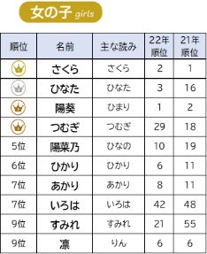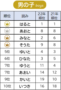 女の子「つむぎ」は18位(21年)→29位(22年)→3位と急上昇しました。昨年放送されたフジテレビのドラマ「silent」で川口春奈さん扮する主人公「紬(つむぎ)」が人気となったことも影響し