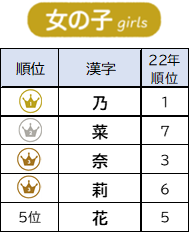 女の子の漢字では、昨年から引き続き1位「乃」が人気です。「葉」や「莉」「花」など、果樹や花の植物を表すボタニカルネームも好まれているようです。