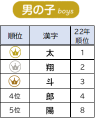 男の子の漢字では「太」、「翔」、「斗」の「た」や「と」のタ行読みで使われる漢字が多くランクイン。どの字も力強く羽ばたく、進む、まっすぐな意味合いの漢字が多いです。