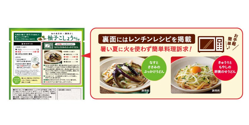 商品裏面には基本の作り方に加え、電子レンジでボリュームアップでき、暑い夏でも火を使わずに簡単に作ることができるレシピを紹介しています。