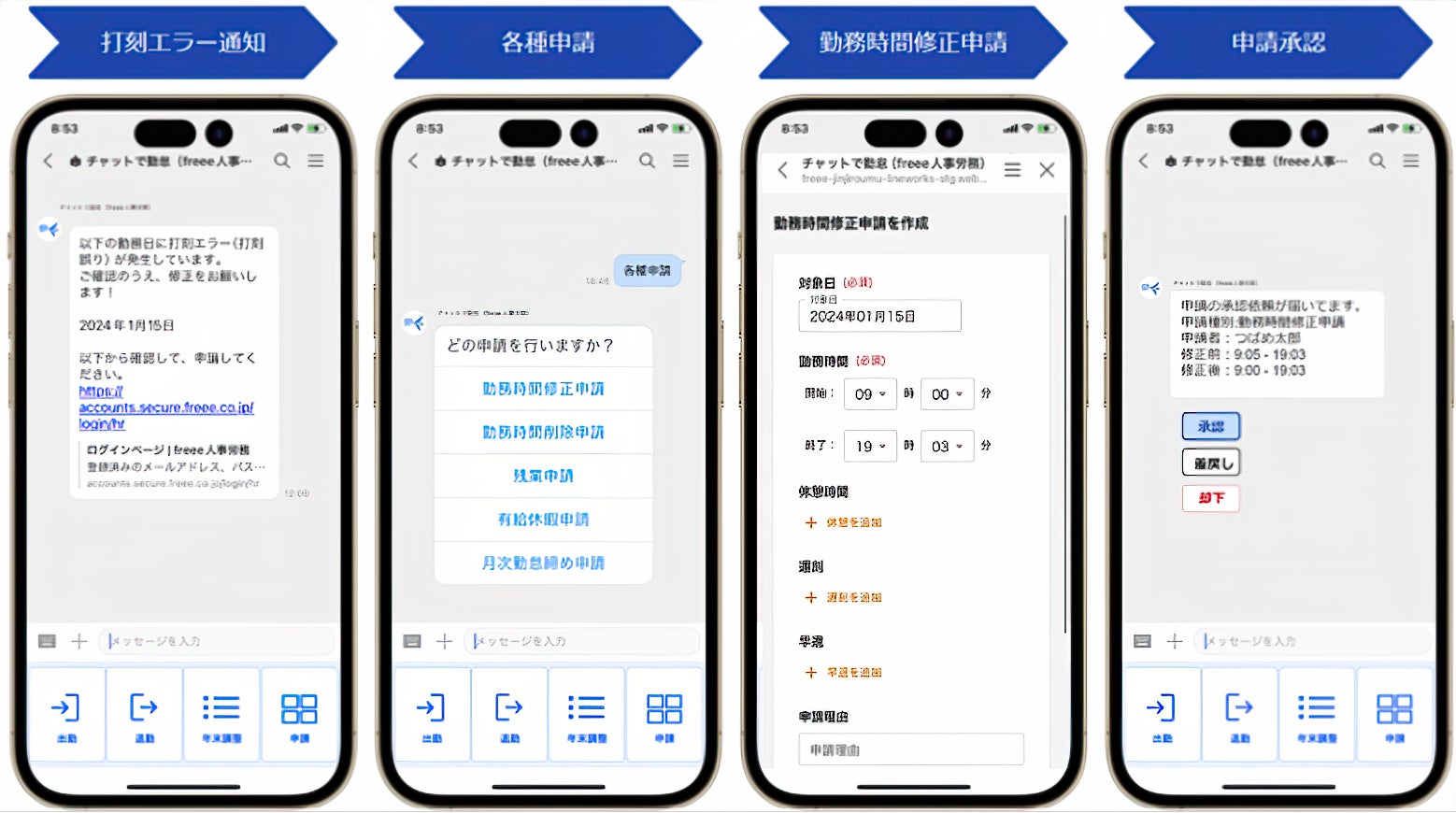 これまで「チャットで勤怠(freee人事労務)」を利用することで「LINE WORKS」で勤怠不備の通知などを受け取ることは可能でしたが、通知を受けたあとにパソコンやスマートフォンから「freee人事労務」にログインし直して再度申請する必要がありました。また承認する側も申請を確認する際に毎回「freee人事労務」にログインしないと申請承認ができないという課題がありました。