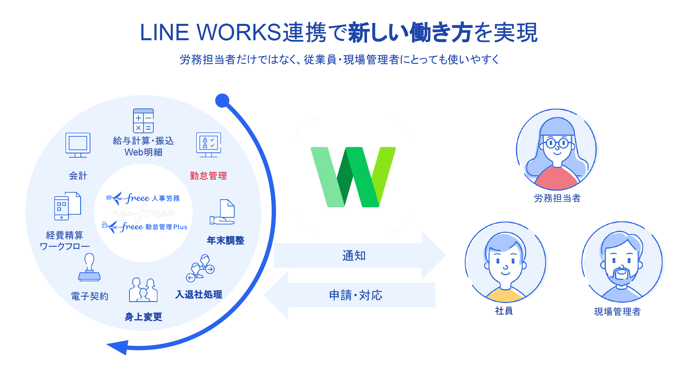 ビジネス現場のコミュニケーションツール「LINE WORKS」を提供するLINE WORKS株式会社(本社:東京都渋谷区、代表取締役社長:増田 隆一)は、フリー株式会社(本社:東京都品川区、CEO:佐々木大輔、以下「freee」)の「freee人事労務」と連携したアプリケーション、「チャットで勤怠(freee人事労務)」において申請承認機能の提供を開始したことをお知らせいたします。