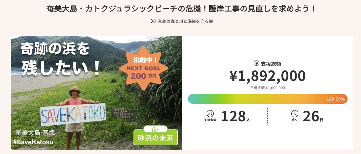 奄美大島の南部、嘉徳(かとく)の砂浜。嘉徳の森の中ではコンクリートブロックが作られ、必要のないコンクリート護岸がつくられようと工事の準備が進行中。この状況を変えるため、この問題をもっと広げていきたいと考えオンライン署名を行い、現在は今後の活動資金の調達に向けクラウドファンディングに挑戦中。