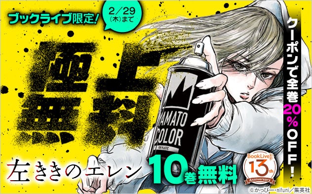 総合電子書籍ストア「ブックライブ」にて2月16日~29日期間限定で、『左ききのエレン』10巻無料&全巻に使える20%OFFクーポンを配布!