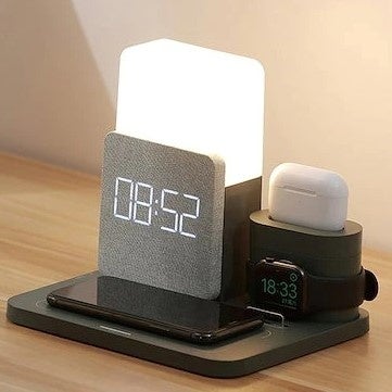 ワイヤレス充電・時計表示・常夜灯利用が出来る多機能充電器。携帯電話・時計・イヤホンを同時に充電できる。