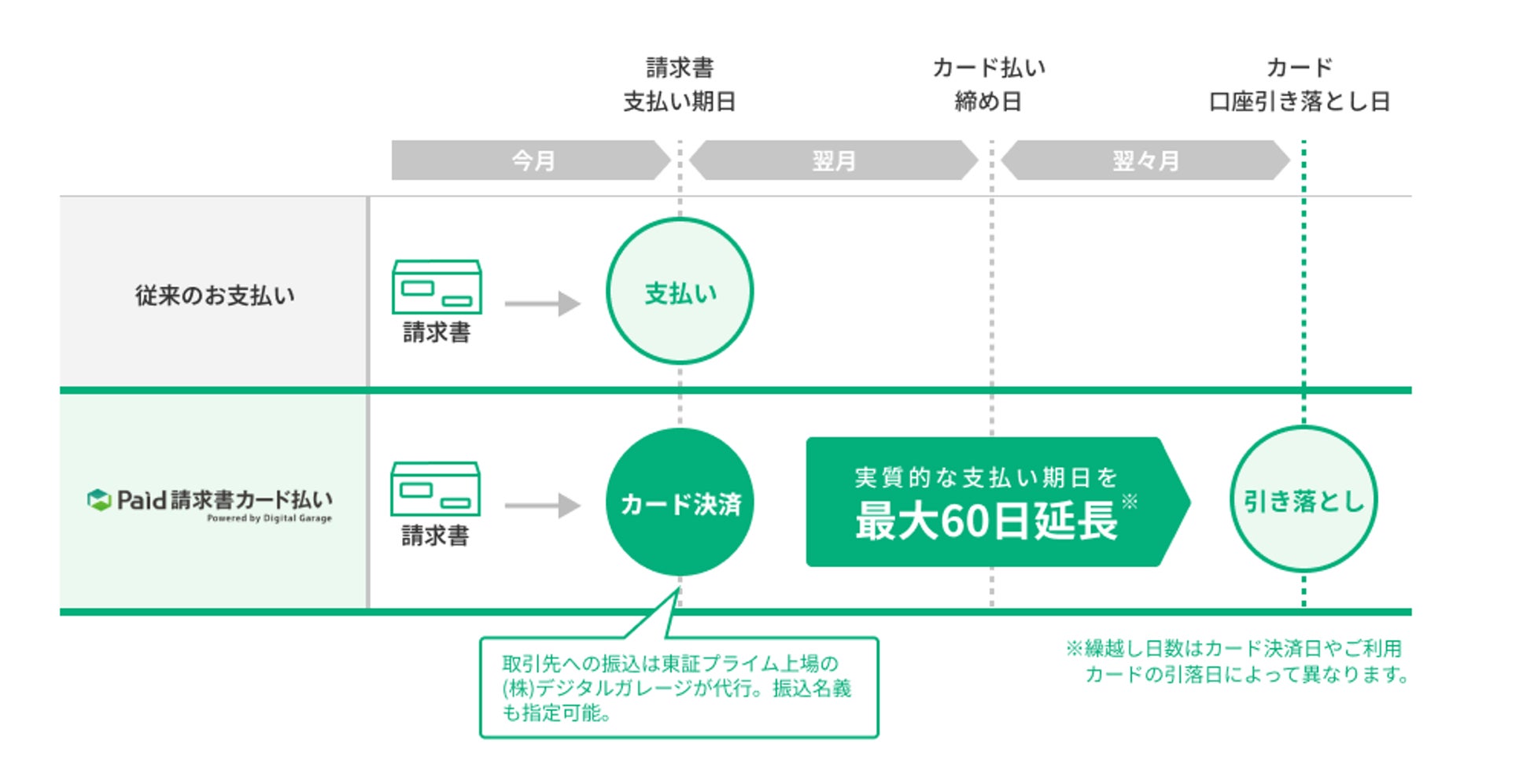 株式会社デジタルガレージ(東証プライム 4819、本社:東京都渋谷区、代表取締役 兼 社長執行役員グループCEO:林 郁、以下:DG)は、株式会社ラクーンフィナンシャル(本社:東京都中央区、代表取締役社長:秋山 祐二、以下:ラクーンフィナンシャル)が提供する企業間決済サービス「Paid」加盟企業の取引先である中小事業者の皆様の資金繰りをサポートする「Paid請求書カード払い powered by Digital Garage」の提供を開始しました。