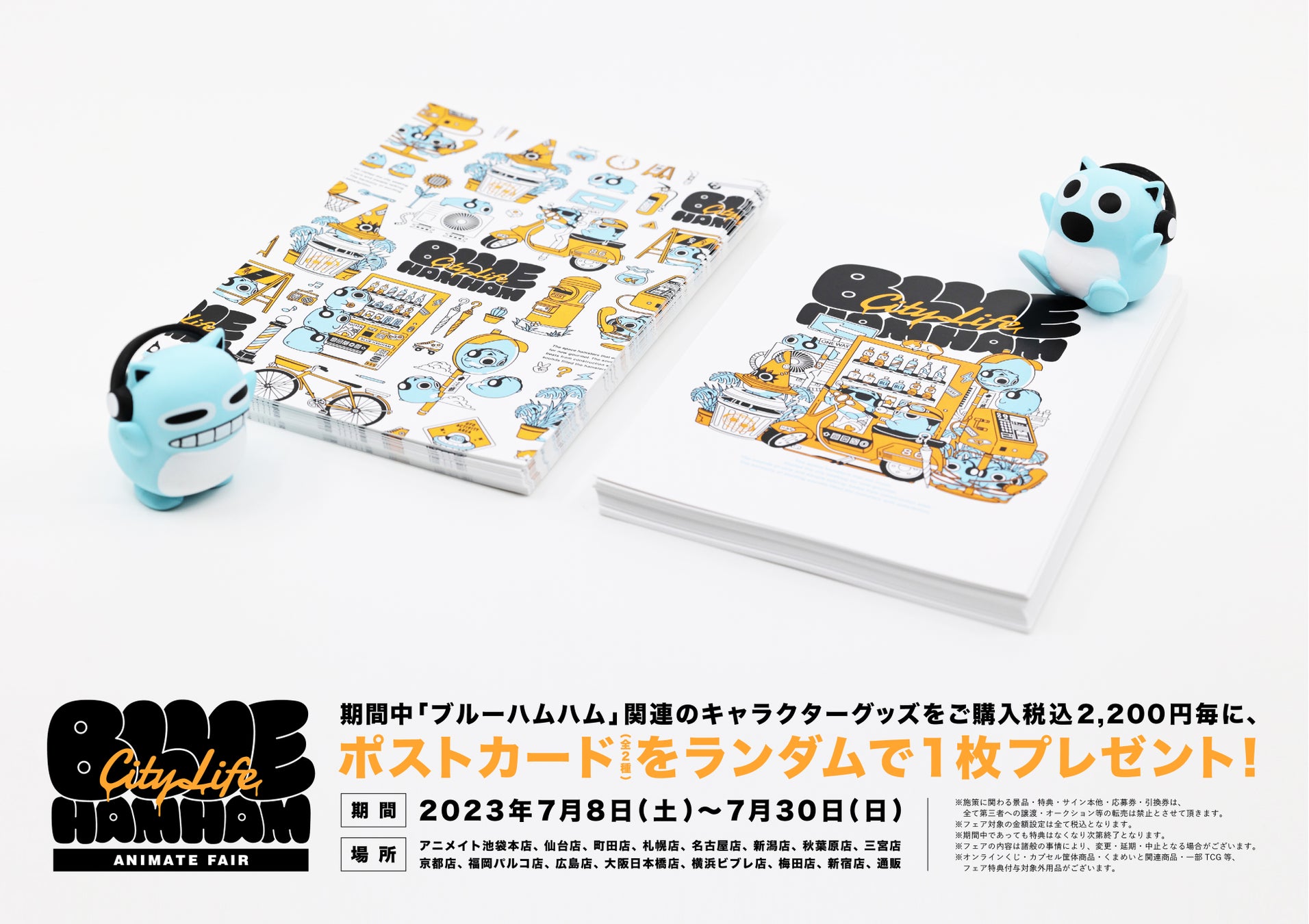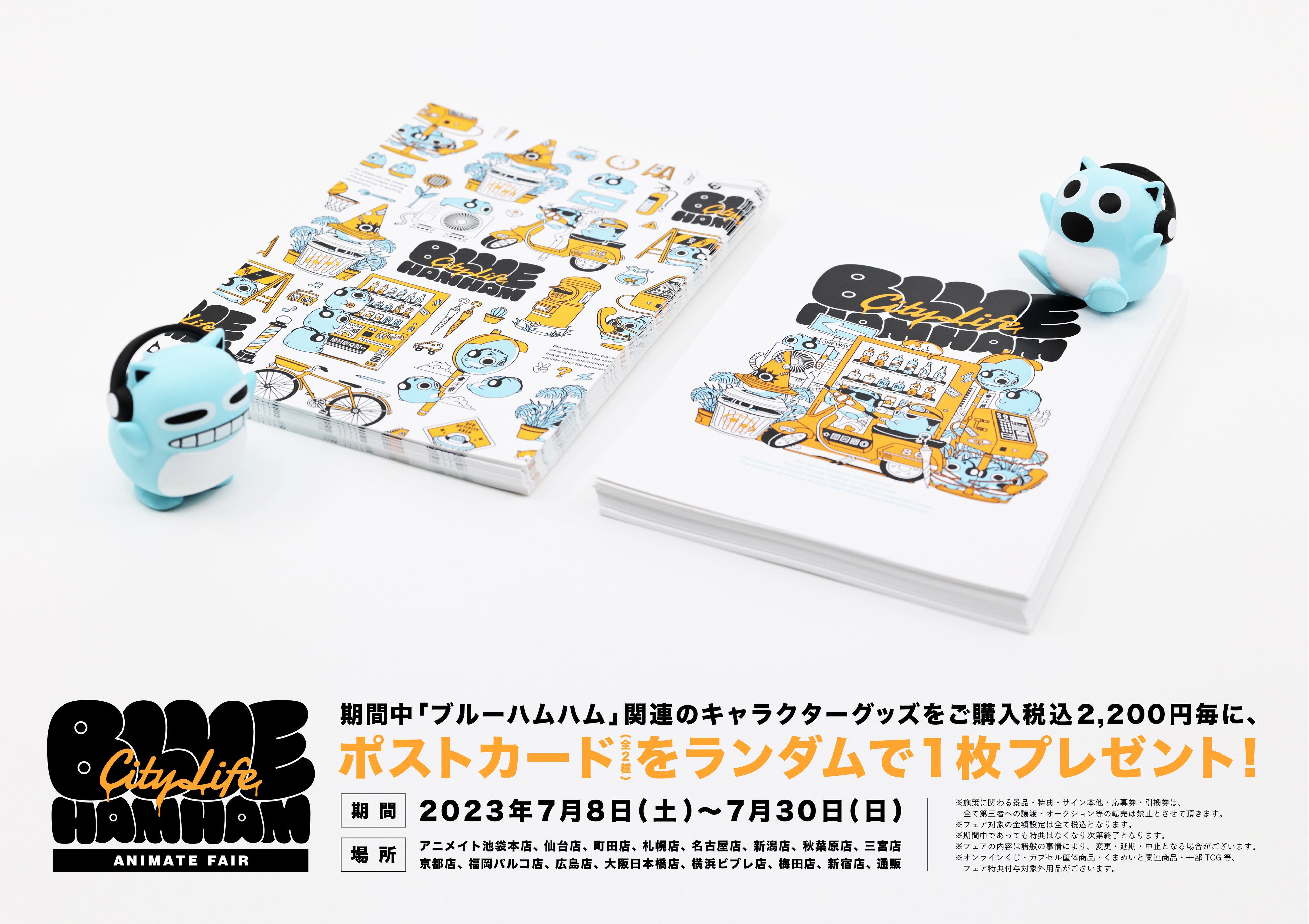 TwitterやTikTokなどSNSでのアニメーション総再生数が7.5億回を超える宇宙ハムスターの4兄弟「ブルーハムハム」が、アニメイト全国15店舗で「City Life」をテーマとしたフェアを開催いたします。おでかけの際に活躍するハンドタオルや巾着のほか、新作イラストが大きくあしらわれたクリアファイルなどが登場いたします。