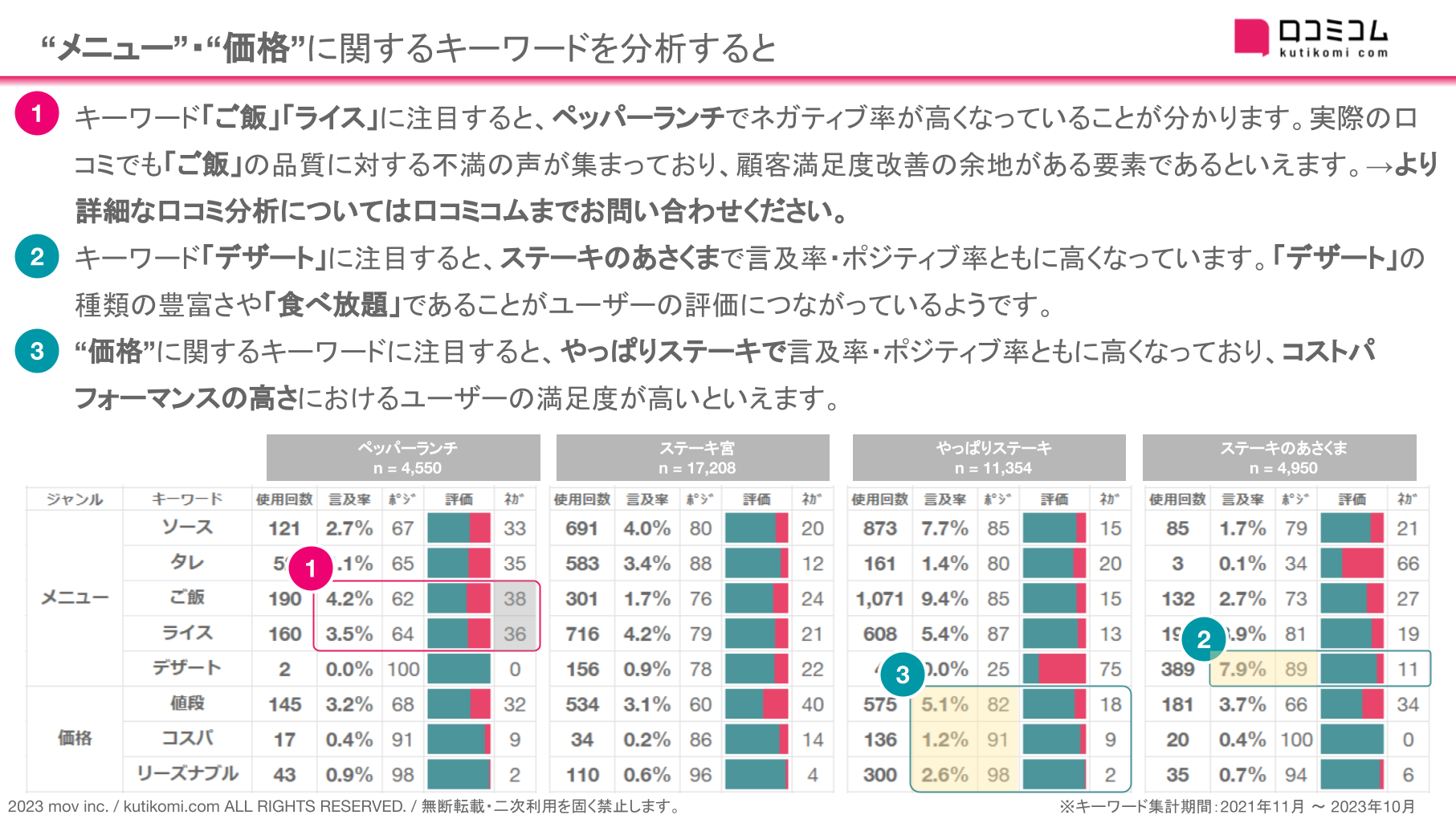 “価格”に関するキーワードに注目すると、やっぱりステーキで言及率・ポジティブ率ともに高くなっており、コストパフォーマンスの高さにおけるユーザーの満足度が高いといえます。