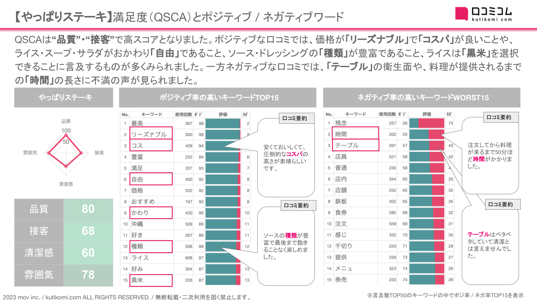 今回は、このAI解析を用いて【やっぱりステーキ】 のQSCA・ポジ / ネガキーワードを確認しました。