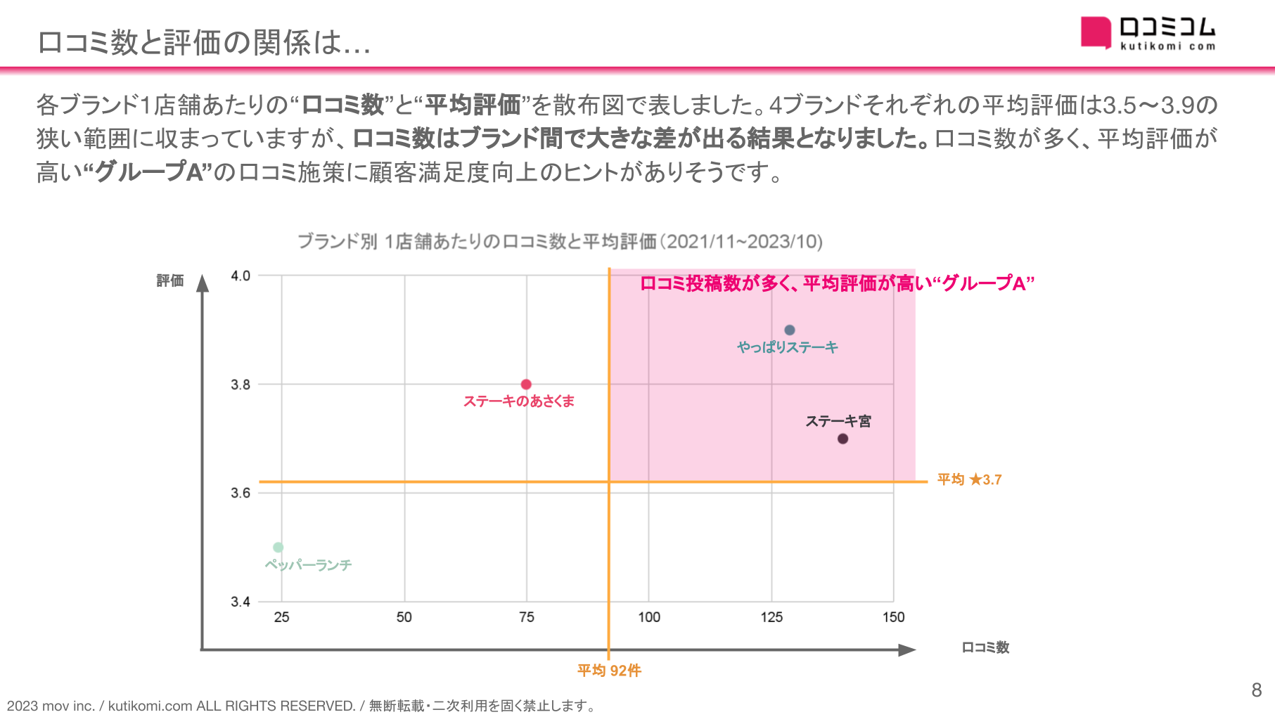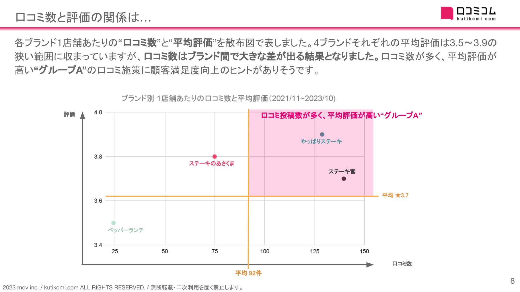 各ブランド1店舗あたりの“口コミ数”と“平均評価”を散布図で表しました。4ブランドそれぞれの平均評価は3.5~3.9の狭い範囲に収まっていますが、口コミ数はブランド間で大きな差が出る結果となりました。口コミ数が多く、平均評価が高い“グループA”の口コミ施策に顧客満足度向上のヒントがありそうです。