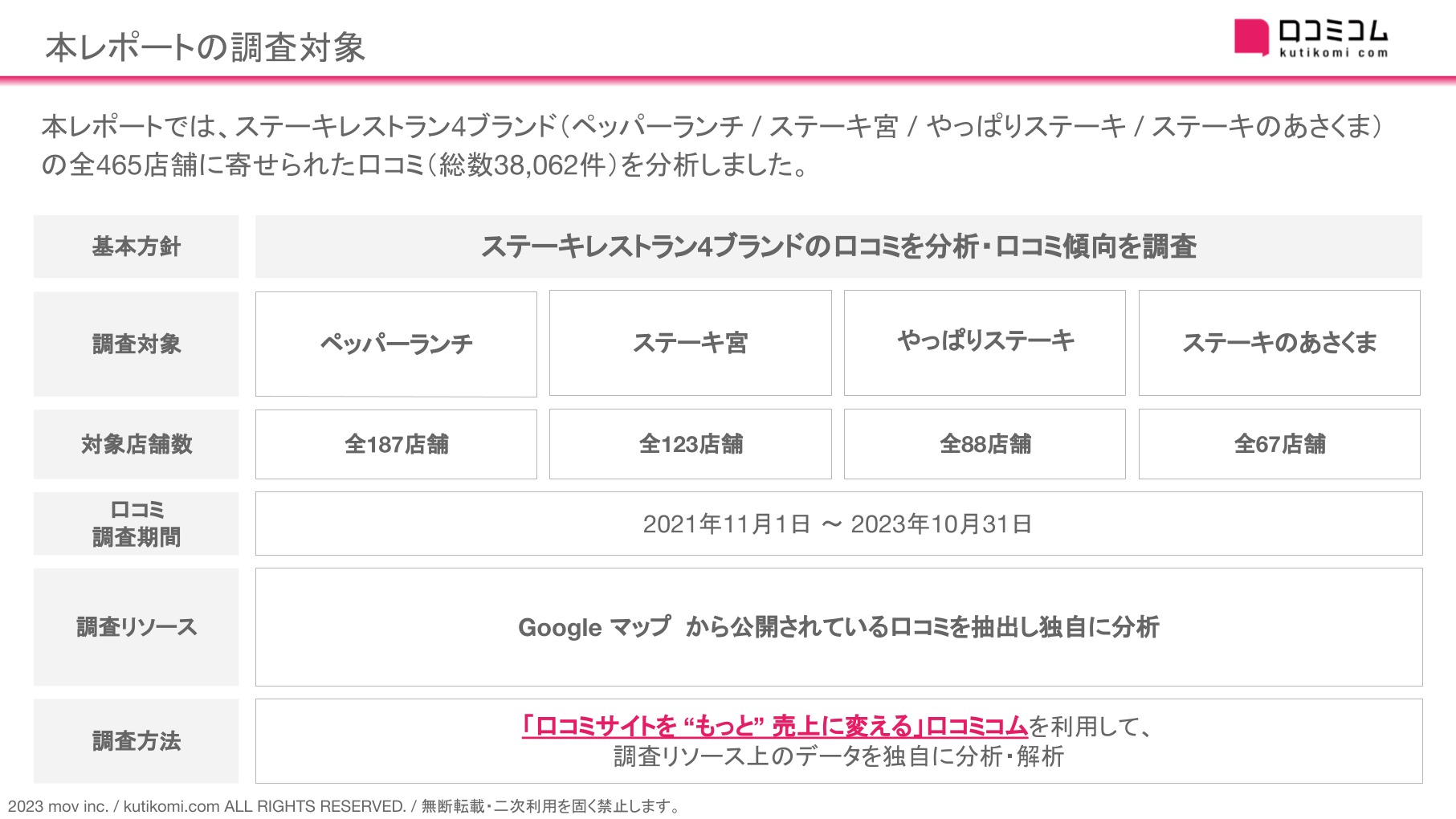 今回は、ステーキレストラン4ブランド(ペッパーランチ / ステーキ宮 / やっぱりステーキ / ステーキのあさくま)に寄せられた約3.8万件の口コミを調査、比較検証をしました。