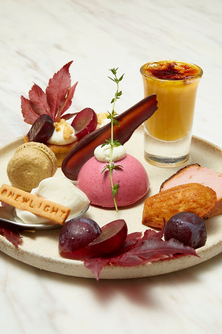 ジューシーさが広がるミニバーガー、甘さとクリーミーさが溶け合う一口サイズの旬のフルーツと淡路ブラータチーズに、鮎のパテとさつまいものサブレや穴子と里芋のテリーヌは秋の風情を感じるしっとりとした一品です。