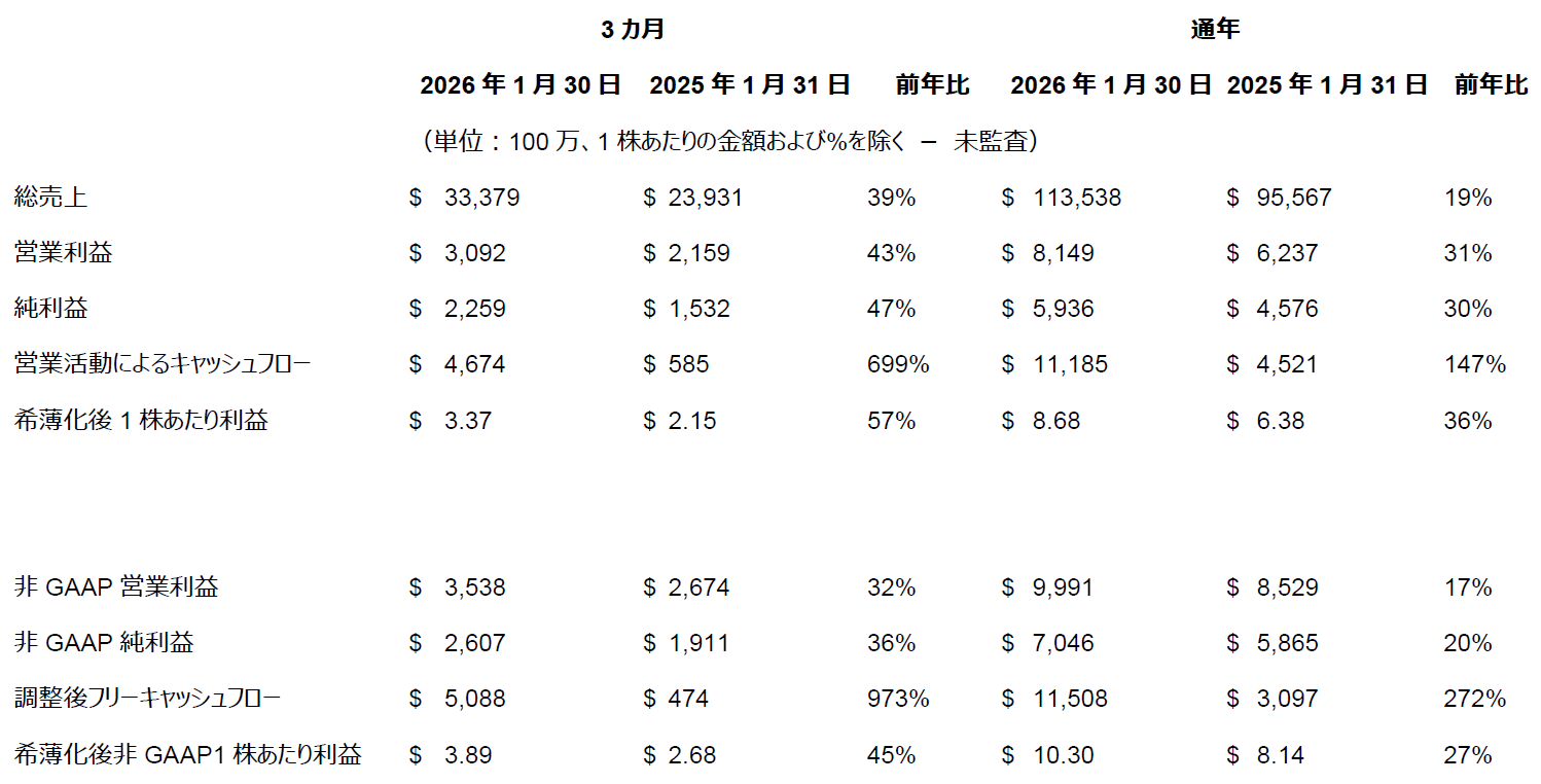 第4四半期の希薄化後1株あたり利益は前年同期比57%増の3.37ドル、非GAAPベースの希薄化後1株あたり利益は前年同期比45%増の3.89ドルで、いずれも過去最高