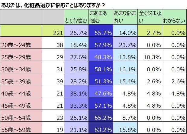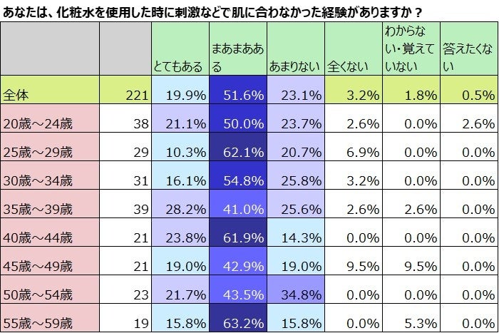 次に化粧品選びに悩むことがあるか否か聞きました。「とても悩む」26.7%と「まあまあ悩む」55.7%を合わせた82.4%が化粧品選びに悩んでいるようです。最後に化粧水を使用した時に刺激などで肌に合わなかった経験について聞きました。「とてもある」19.9%と「まあまあある」51.6%を合わせた71.5%と7割を超える人が化粧水のよる刺激の経験があるようです。「あまりない」は23.1%「全くない」3.2%でした。