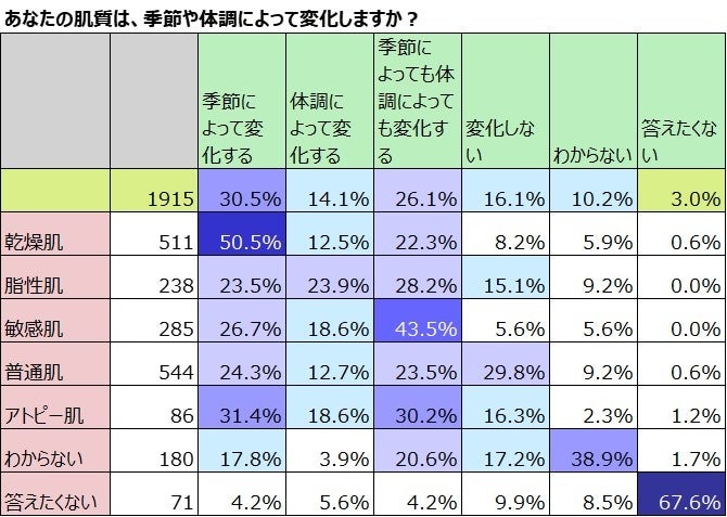 次に肌質別で見てみました。普通肌は「変化しない」が最も多く29.8%です。乾燥肌は「季節によって変化する」が最も多く、50.5%と最も多いことがわかります。敏感肌は「季節によっても体調によっても変化する」が43.5%と最も多いことがわかりました。「季節によって変化する」26.7%と「体調によって変化する」18.6%と合わせると88.8%と約9割の人が変化を感じています。「体調によって変化する」が最も多いのは23.9%の脂性肌でした。「変化しない」が最も多いのは敏感肌の5.6%、続いて「乾燥肌」の8.2%でした。