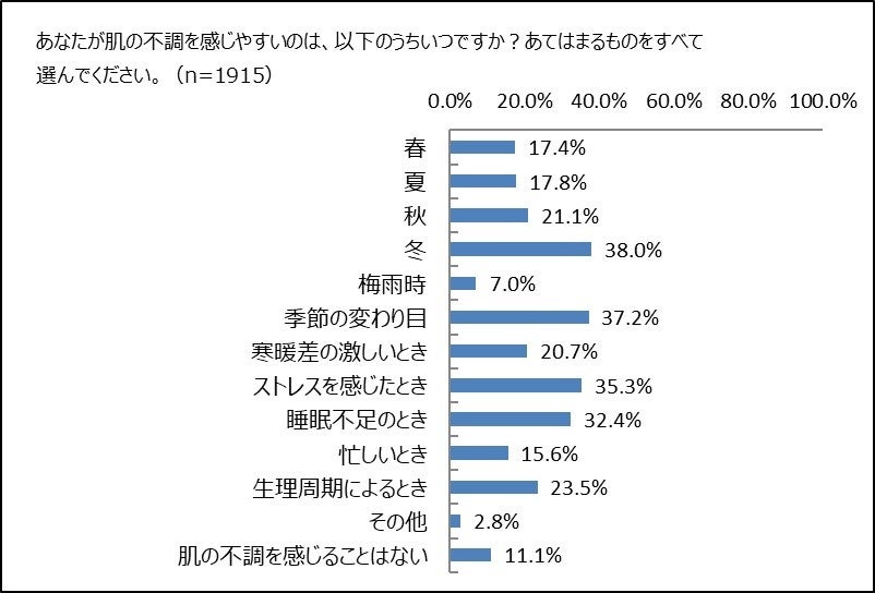 肌の不調を感じやすい季節や状況を聞きました。(複数選択のため、合計が100%にはなりません。)最も多いのは「冬」で38.0%と4割近くが不調を感じています。その次は「季節の変わり目」で37.2%と1位の「冬」と近似値です。続いて「ストレスを感じたとき」35.3%、「睡眠不足のとき」32.4%と続きました。「肌の不調を感じることはない」は11.1%と約1割でした。