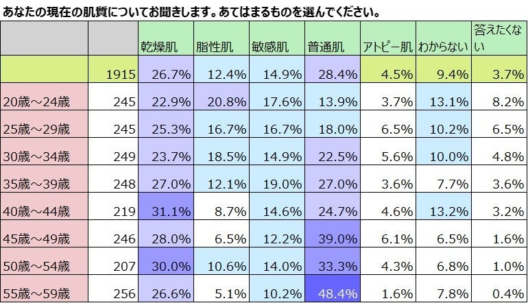 全国の20歳~59歳の女性1,915名に現在のご自身の肌質について聞きました。最も多いのは「普通肌」で28.4%、その次は「乾燥肌」で26.7%でした。3位は「敏感肌」で14.9%、4位は「脂性肌」で12.4%。「アトピー肌」と答えたのは4.5%で「わからない」と答えた人も9.4%と1割近くにもなりました。これを年齢別に見てみました。1位の「普通肌」は年齢が上がるほどに割合が増える傾向があり、20歳前半では13.9%のみですが、50代後半では48.4%と約半数になります。「乾燥肌」は比較的若年層よりも高齢層の方が多い傾向がありますが、それほど大きな差ではないことがわかります。「敏感肌」は比較的高齢層よりも若年層の方が多く20代~30代は約2割、40代~50代は約1割です。「脂性肌」は20代前半が最も多く20.8%と約2割で40代を過ぎると約1割から1割未満と少なくなります。「アトピー肌」は50代後半が1.6%と少ないものの、母体数自体が少ないため年齢による差を確認できません。「わからない」と答えた人は比較的若年層に多いですが、40代後半が最も多く13.2%でした。