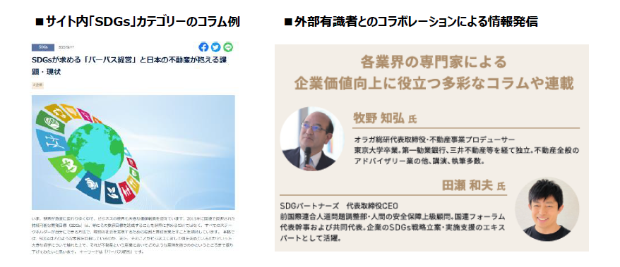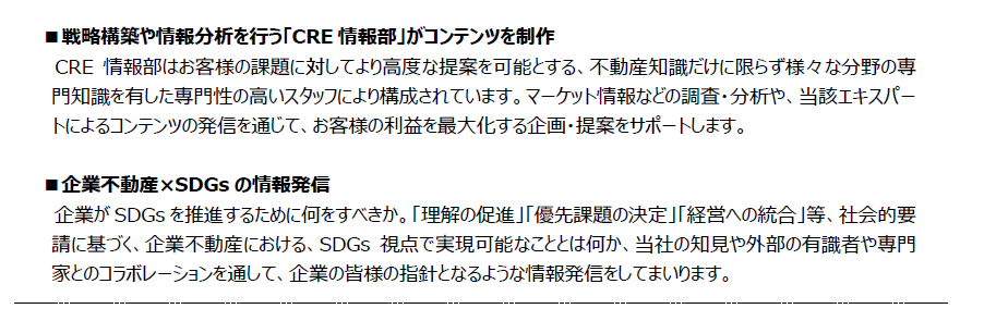 「CRE-NAVI」では、これまで当社が培ってきた事業・収益用不動産に関する独自の知見・ノウハウや企業が抱える経営課題等へ提供したソリューションナレッジ、さらにSDGs視点を加えた新たな不動産の評価方法等、様々な情報発信を通し、企業がCRE戦略を行うためにお役立ていただける情報を発信いたします。