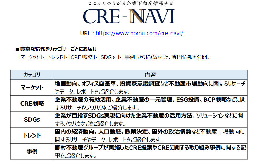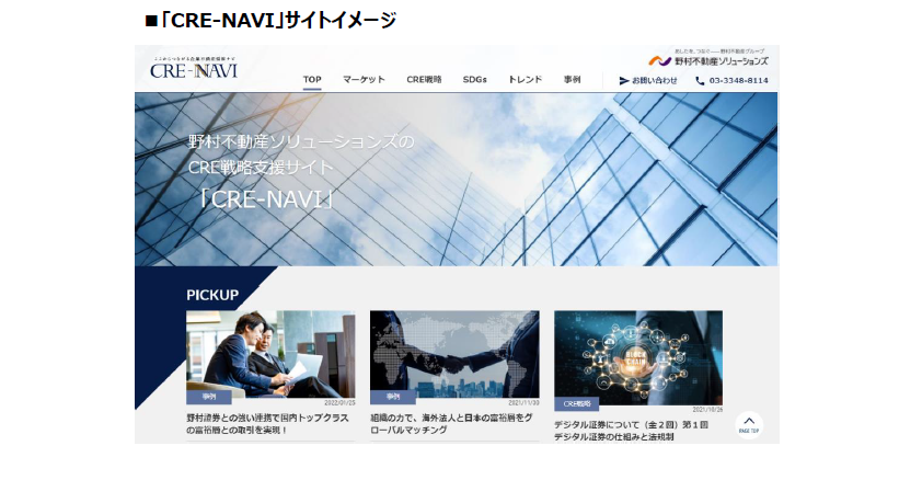 野村不動産ソリューションズ株式会社(本社:東京都新宿区/代表取締役社長:前田 研一)は、2022年3月25日より、CRE戦略支援サイト「CRE-NAVI」を開設しましたので、お知らせいたします。