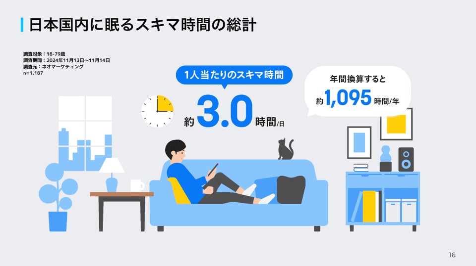 こうした中、メルカリが今年11月に行った「スキマバイトに関する調査」(※4)で、日本国内に眠るスキマ時間の総計を調査したところ、1人あたりのスキマ時間は1日あたり約3.0時間あり、年間で換算すると約1,095時間にものぼることもわかりました。